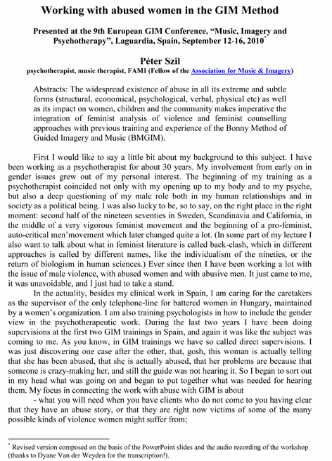 Presentation at the 9th European GIM Conference, “Music, Imagery and Psychotherapy”, Laguardia, Spain, September 12-16, 2010