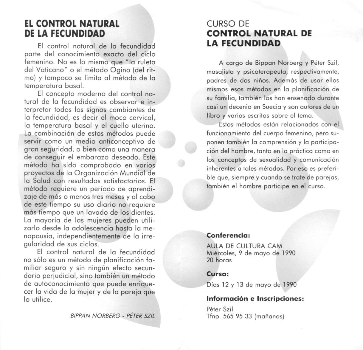Folleto de una conferencia y un curso sobre Control natural de la fecundidad en mayo de 1990.