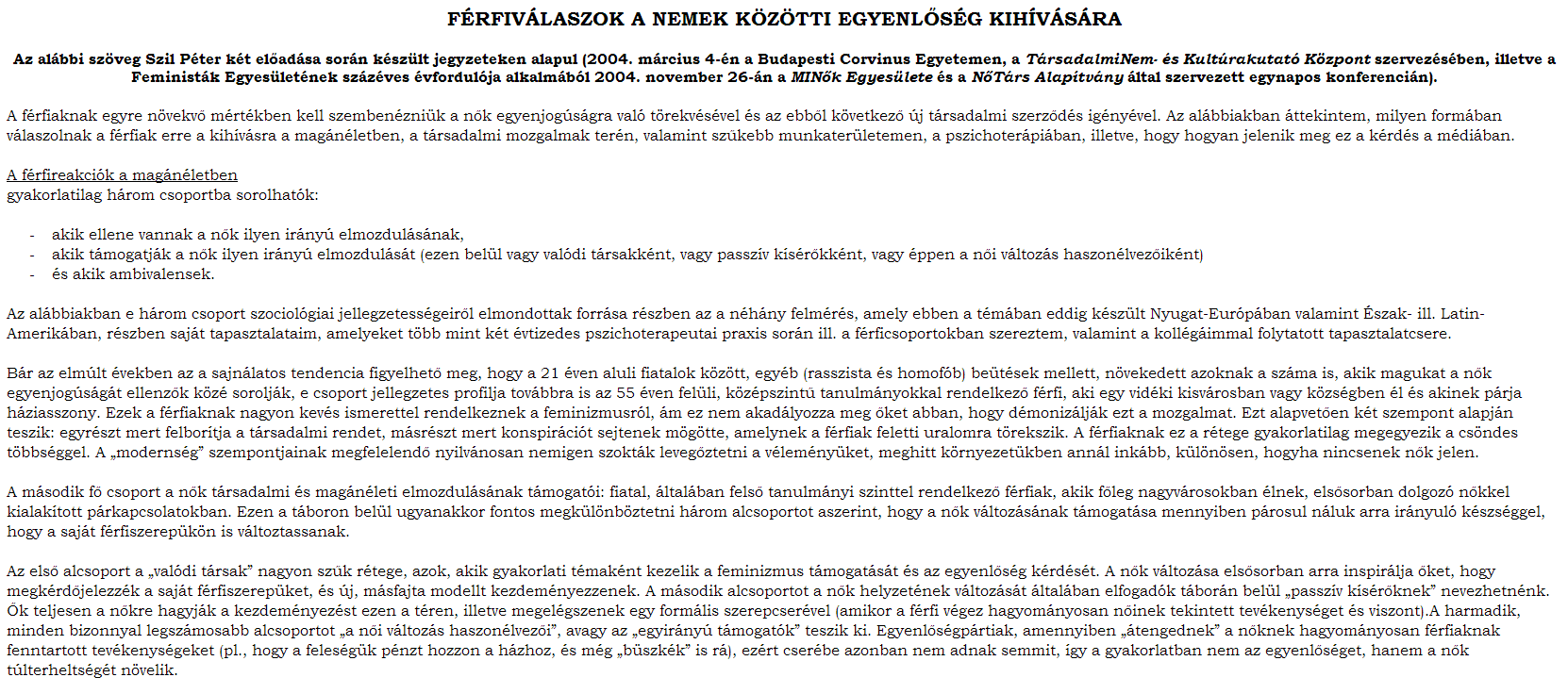 Az alábbi szöveg két előadásom során készült jegyzetek átirata (2004. március 4-én a Budapesti Corvinus Egyetemen, a TársadalmiNem- és Kultúrakutató Központ szervezésében, illetve 2004. november 26-án a Feministák Egyesületének százéves évfordulója alkalmából a MINők Egyesülete és a NőTárs Alapítvány által szervezett egynapos konferencián).