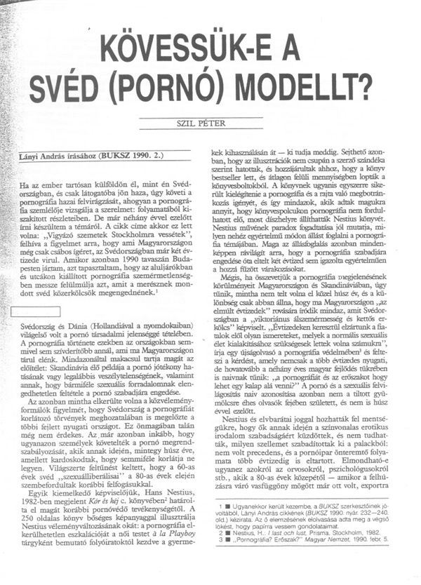 «Ha az ember tartósan külföldön él, mint én Svédországban, és csak látogatóba jön haza, úgy követi a pornográfia hazai felvirágzását, ahogyan a pornográfia szemlélője vizsgálja a szerelmet: folyamatából kiszakított részleteiben. De már néhány évvel ezelőtt írni készültem a témáróL A cikk címe akkor ez lett volna: „Vigyázó szemetek Stockholmra vessétek” [...]