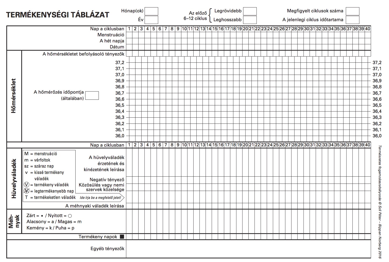 A fenti (rákattintva kinagyítható) képen a módszer használata során kitöltendő termékenységi táblázat megújult, A4-es formátumú változata látható.A kinyomtatható és szabadon másolható pdf letölthető innen. Címkék természetes fogamzásszabályozás