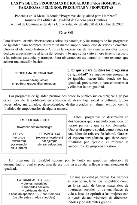 Ponencia en la Mesa Redonda “Programas de Igualdad para Hombres”, Jornada de Política de Igualdad de Género para Hombres, Facultad de Comunicación de la Universidad de Sevilla, 2006-10-20. Ver también reportaje de EL PAÍS.