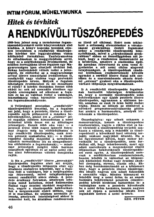 Első változata annak az írásnak, amely aztán külön fejezetként került be a "Természetes fogamzásszabályozás" 1992-es második, átdolgozott, bővített kiadásába. A könyv első kiadásának évszáma 1988, nem pedig 1989, mint az itt közölt cikkben tévesen áll. A könyv harmadik kiadása 2001-ben jelent meg (lásd itt).