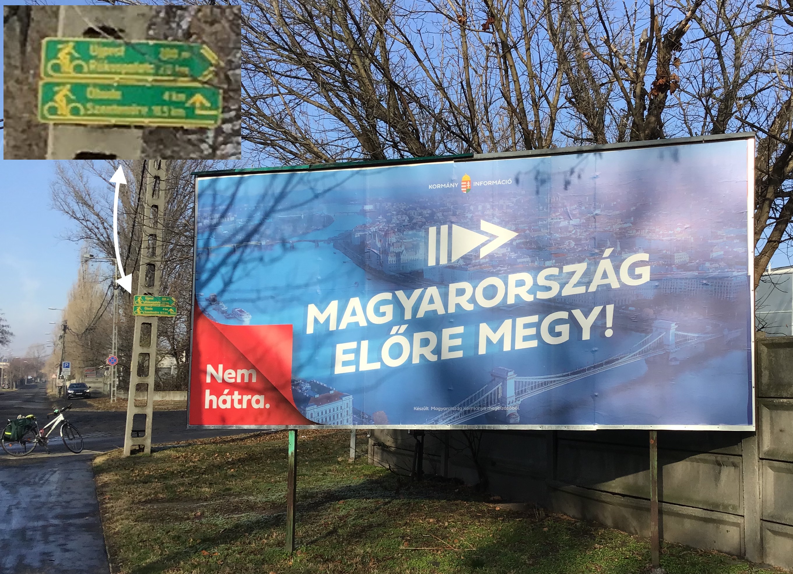 A zavart az okozta, hogy ahhoz, hogy a Római-part felé folytassam utamat, mindenképpen Óbuda és Szentendre, tehát előre fele kellett tovább mennem, ahogy ezt a biciklis útirányjelző tábla is egyértelműsítette. Ezzel szemben  a kormányzati plakátkampány által kijelölt irány azt jelezte, hogy az előre vezető útra jobbra fordulva kell rátérnem, ami a biciklis útirányjelző tábla szerint Újpestre, illetve Rákospalotára vitt volna el. (Lásd a fenti, rákattintva kinagyítható képet.)